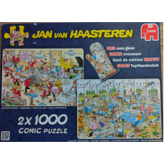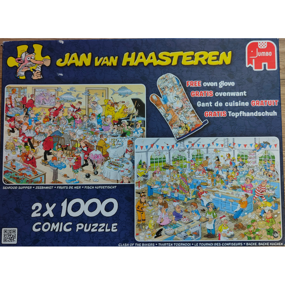 De Jan van Haasteren Eet- en Bakfestijn puzzel van 2 x 1000 stukjes laat blijken dat alles in het restaurant en in de keuken altijd een beetje chaotisch verloopt.